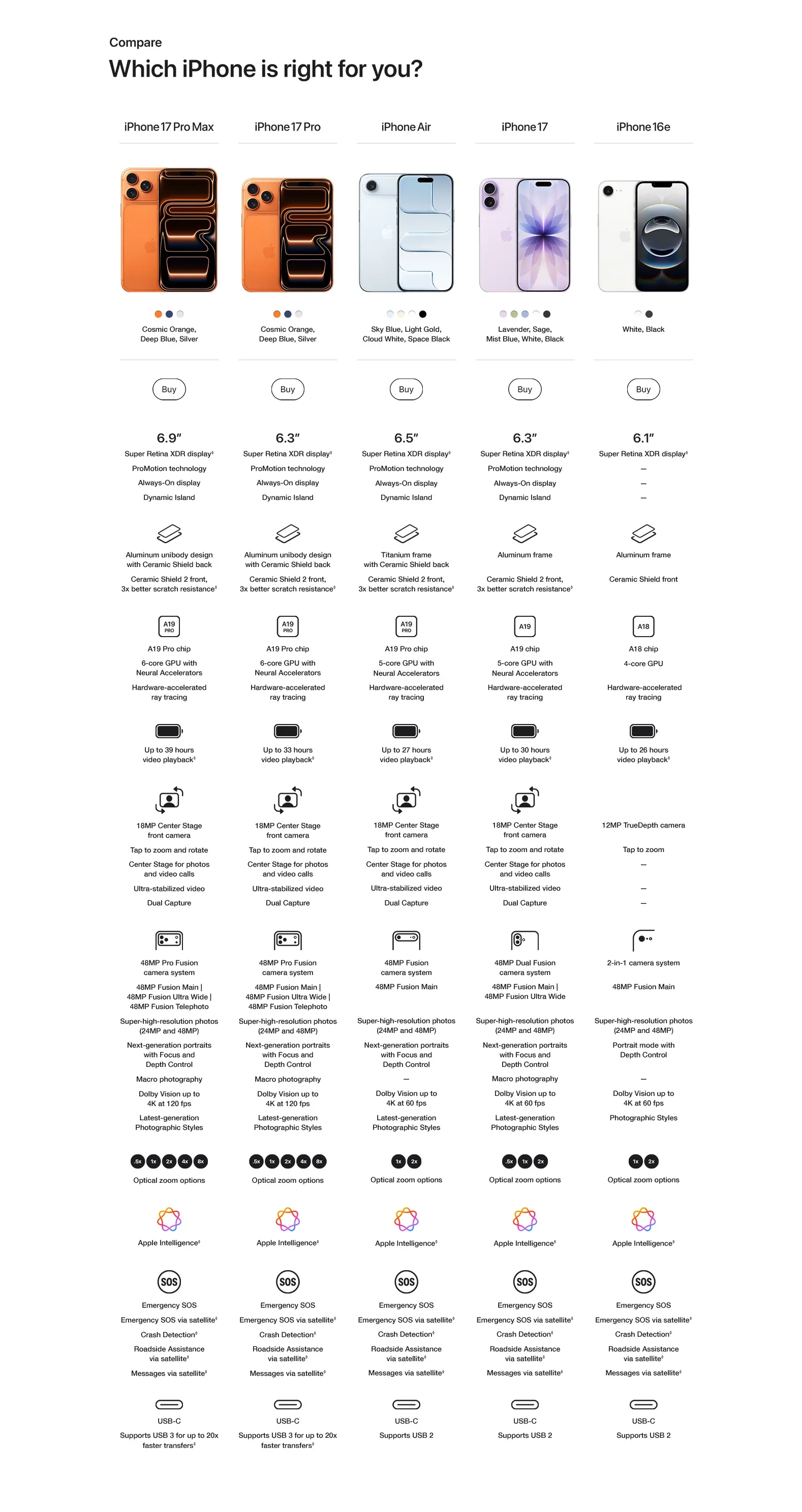 1The display has rounded corners that follow a beautiful curved design, and these corners are within a standard rectangle. When measured as a standard rectangular shape, the screen is 6.27 inches (iPhone 17, iPhone 17 Pro), 6.55 inches (iPhone Air), or 6.86 inches (iPhone 17 Pro Max) diagonally. Actual viewable area is less.